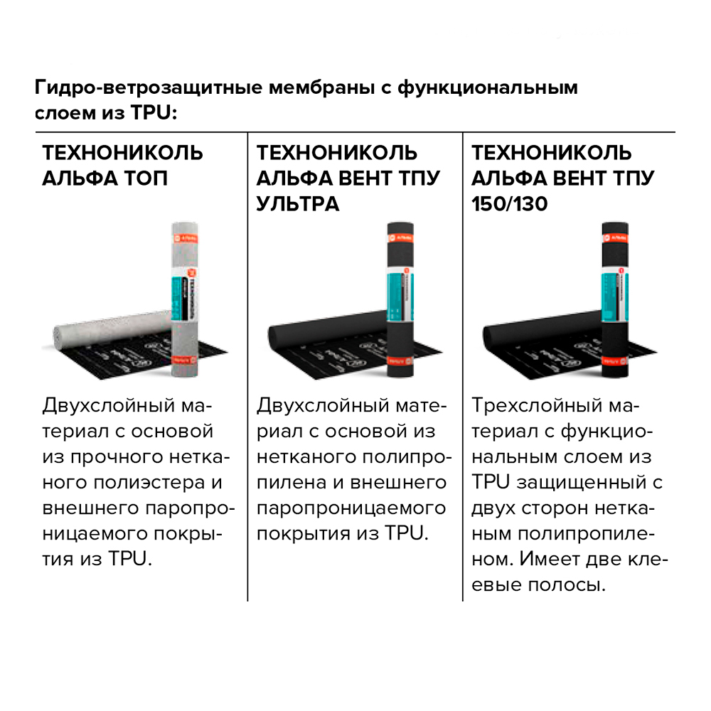 Диффузионная мембрана ТЕХНОНИКОЛЬ АЛЬФА ВЕНТ ТПУ 150 – трёхслойный материал с функциональным слоем из паропроницаемого покрытия — термопластичного полиуретана, защищённого с двух сторон полотном из нетканого полипропилена.